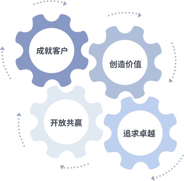 成就客户是一切决策的出发点,,,,创造价值是衡量所有工作的标准,,追求卓越是我们做事做人的态度,,开放共赢是我们的格局也是最终的结果。。。价值观的齿轮环环相扣,,,,推动着组织里的每个人不断向前。。