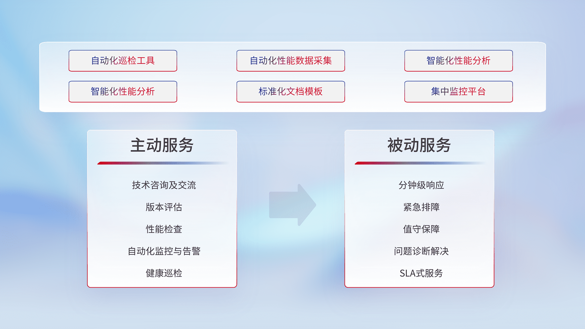 智能化工具和标准化文档,,保障服务质量,,,提供主动服务(包含技术咨询、、版本评估、、性能检查、、自动化监控与告警、、健康巡检)和被动服务包含(分钟级响应、、、紧急排障、、、值守保障、、问题诊断解决、、SLA服务)。。。。