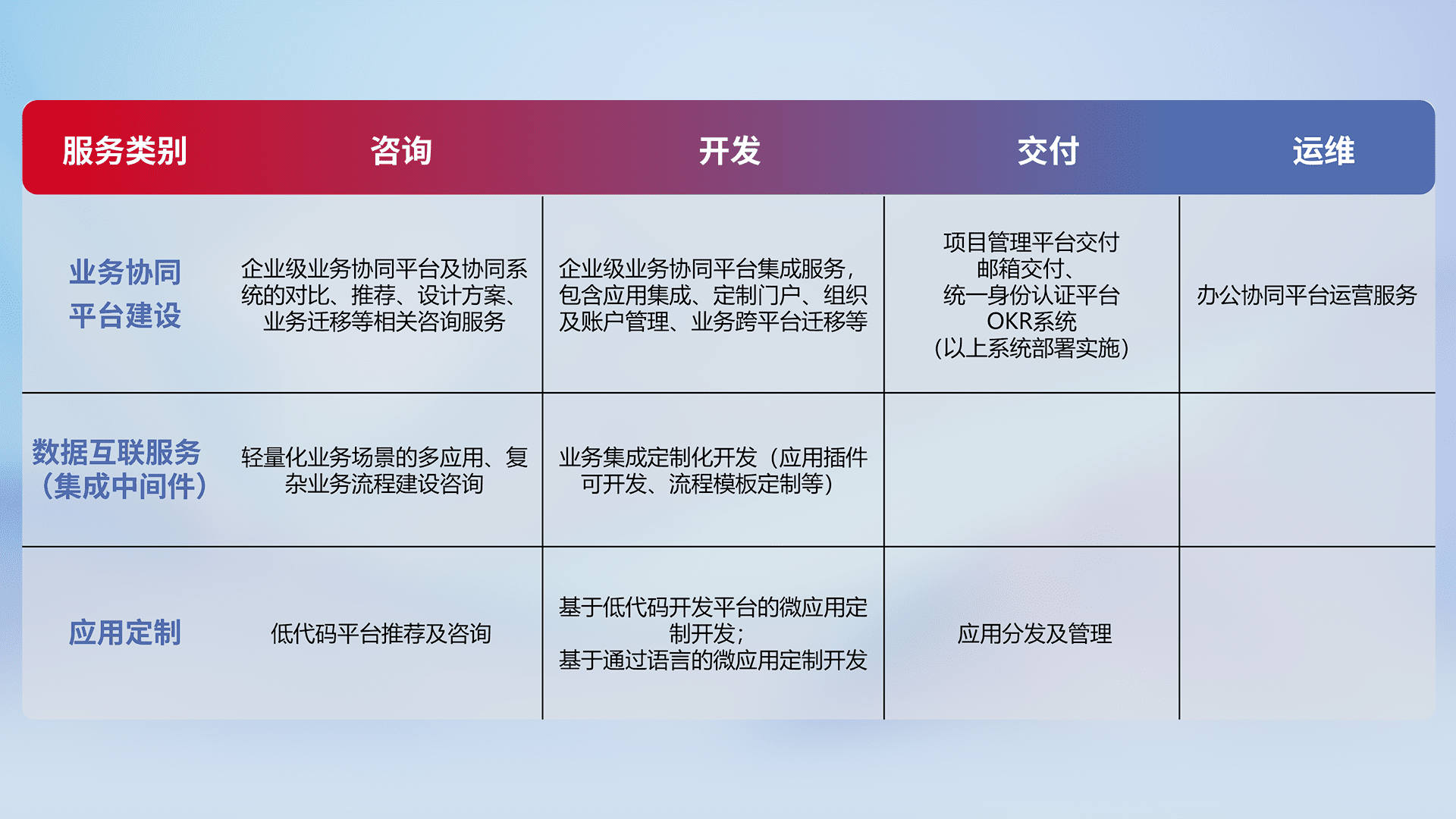 针对钉钉、、、、企微、、IDaas等平台级产品提供产品的规划、、、方案、、、交付、、、定制化开发等服务,,,,实现如统一协同办公、、、、智能客户服务、、、、混合会议管理、、、智能数据查询、、、、等业务场景,,,实现数字化转型。。。